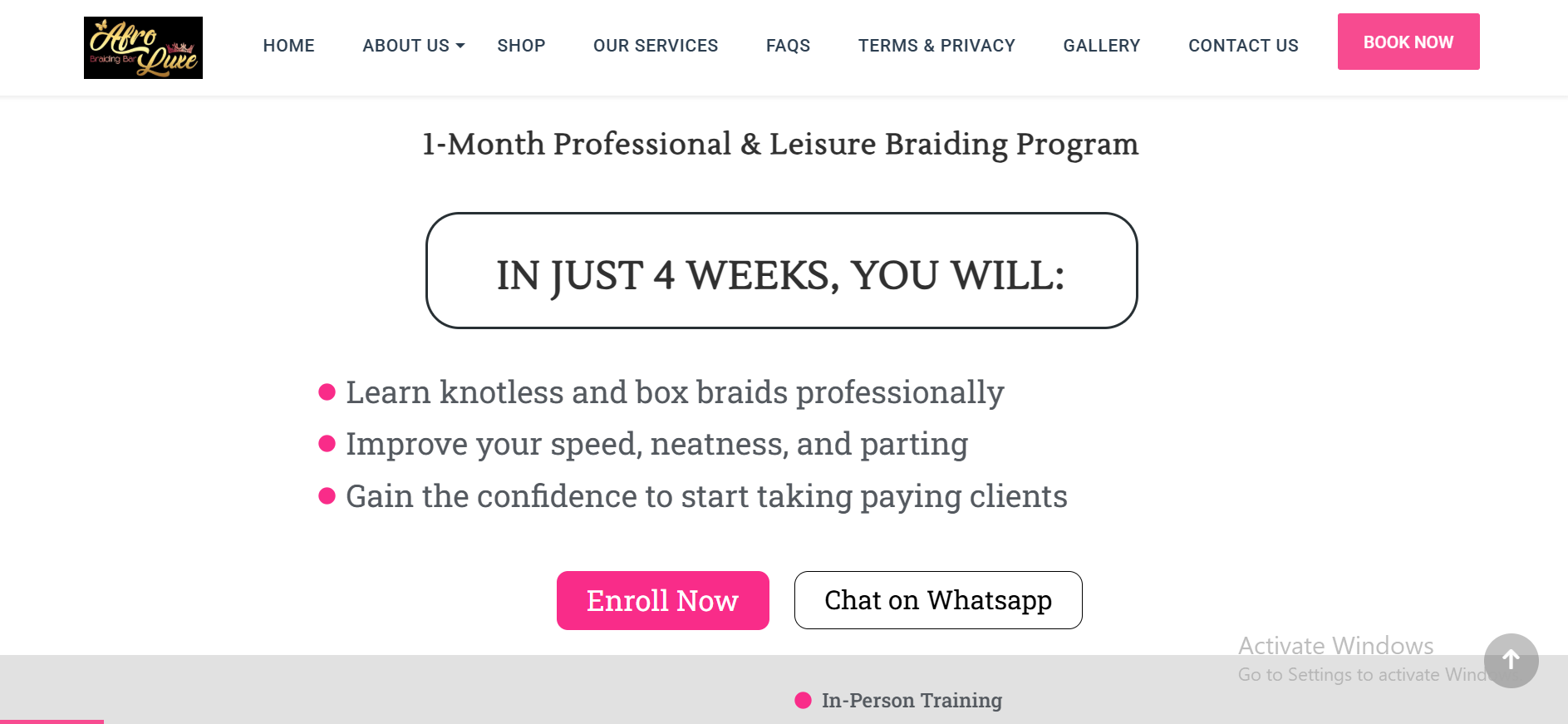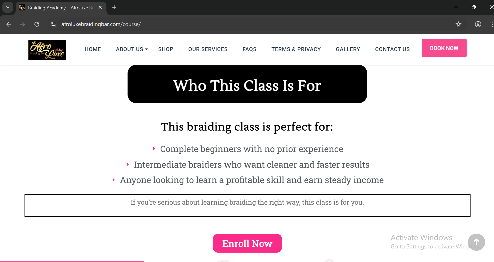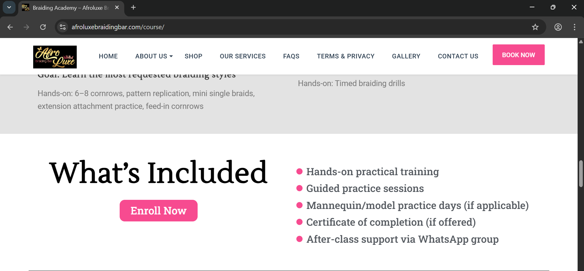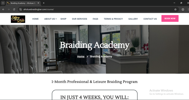 Afroluxe Braiding Bar’s Course Landing Page
